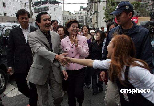 包括县市长选举在内的台湾“三合一”选举十二月三日开始投票,图为中国国民党主席马英九陪同该党台北县长候选人周锡玮(左一)前往投票点投票。 作者:宗金柱