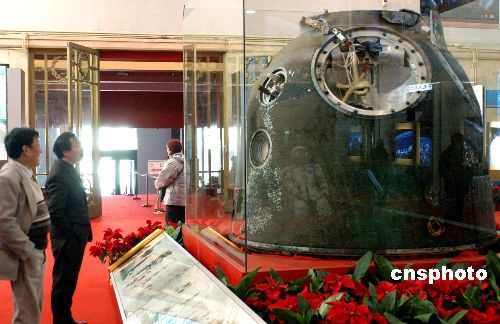 十二月五日,在北京中国国家博物馆主办的“神舟六号载人航天飞行大型纪实摄影展览”上,一些观众长久站在神舟六号载人航天飞船返回舱前观看。该展览还展出了大量神舟载人航天飞船的控制仪器、实验装置和部件,其制造工艺精良,令参观者感叹。作者:邹宪