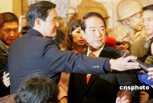 十二月十二日晚,中国国民党主席马英九与亲民党主席宋楚瑜在台北举行县市长选举后的首次会谈,议题涉及国亲两党合并。图为二人在会谈前与记者见面。作者:宗金柱