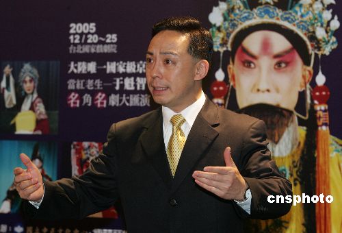十二月十三日,“中国京剧院名角名剧大汇演”演出团抵达台北并举行记者会,此次大汇演将于十二月二十日至二十五日在台北市连演八场。图为领衔的头牌老生于魁智在记者会上清唱一曲《三家店》。作者:宗金柱