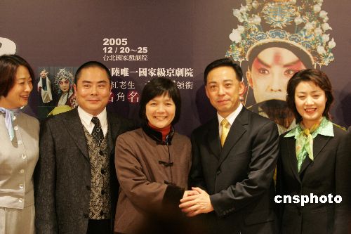 十二月十三日,“中国京剧院名角名剧大汇演”演出团抵达台北并举行记者会,此次大汇演将于十二月二十日至二十五日在台北市连演八场。图为头牌老生于魁智(右二)、梅派青衣李胜素(右一)等与当地媒体见面。作者:宗金柱