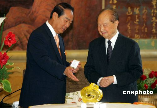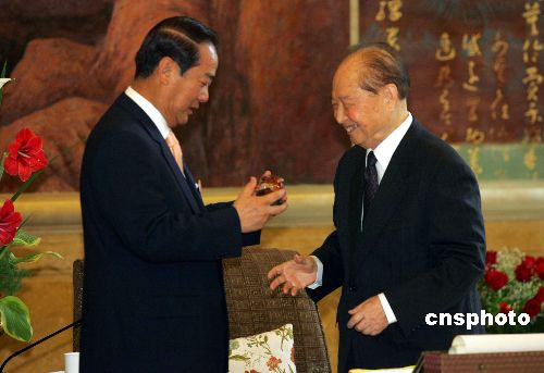 五月八日,正在上海访问的亲民党主席宋楚瑜拜会海峡两岸关系协会会长汪道涵,并向汪道涵赠送琉璃纪念品。作者:潘索菲