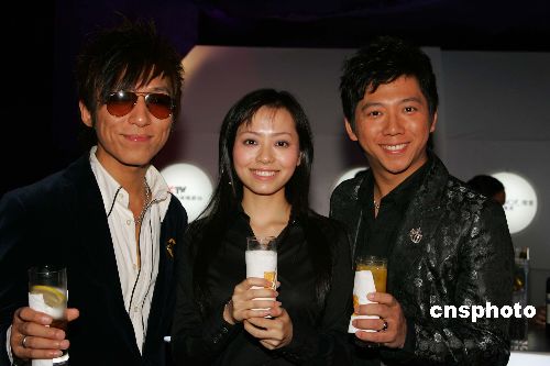 一月十一日晚﹐第十二届全球华语音乐榜中榜在香港举行隆重颁奖典礼﹐张靓颖(中)获得雅虎搜索最热门年度歌手﹐羽泉获得内地最佳乐队组合奖。图为张靓颖与羽泉组合合影。作者:潘索菲