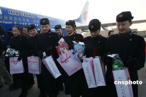 图:两岸春节包机国航为乘客准备“福娃”礼物