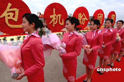 1月25日上午,2006年两岸春节包机厦门航点首航仪式在厦门高崎国际机场停机坪举行,首航仪式由厦门飞往台北和高雄的两个航班合并举行。图为首航仪式上准备为台胞献花的厦航空姐着新装迎候。作者:刘可耕