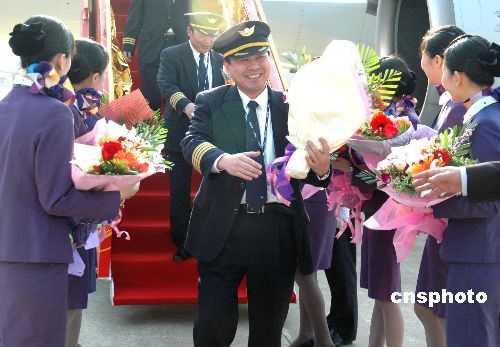 七日下午三时四十分左右,从高雄飞来的厦门航空公司MF八八四航班缓缓降落在厦门高崎机场,这既是今年厦门航点、同时也是大陆所有航点最后一班两岸春节包机,至此,今年两岸春节包机在台胞的赞许和期待中圆满落幕。图为厦航机组人员结束包机任务归来。作者:林锦州