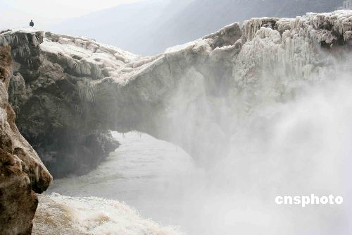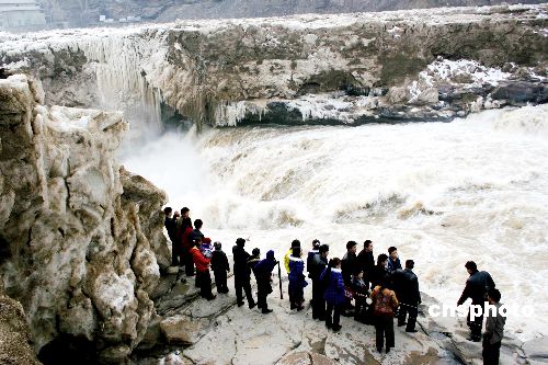 2006年2月7日,黄河壶口许多冰封已消,众多游人在观看解冻的壶口瀑布。去年腊月黄河壶口碰到百年不遇的奇观,冰块将瀑布覆盖封死,游人看不到瀑布,听不到咆哮声。这几天气温回升,壶口瀑布附近的冰凌部分已经融化,游人可以站在岸边看瀑布,听瀑声。作者:张旦