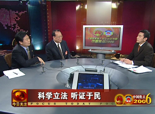 | 聚焦三月的北京,中国人用智慧决策未来,用爱心规划家园,用责任拥抱世界。2006的这个春天,中国播下了新的种子,13天的真诚互动,13个牵动百姓的期待。中央电视台中文国际频道《今日关注》携手中国新闻社等多家媒体倾听百姓声音,解读《中国焦点》。