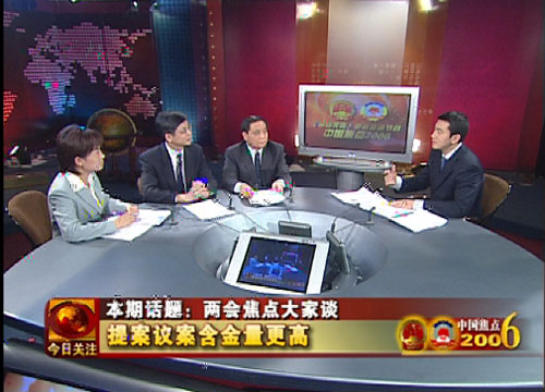 两会已经圆满结束了,今天我们在演播室要来盘点一下两会的报道和两会的相关焦点。在10多天的报道当中,我们《今日关注》是和包括央视国际网站、《人民日报》海外版、国际在线、中新网、中新社以及新浪网等八家媒体共同连动来关注这次两会的热点。今天的节目当中,我们又请到了三位嘉宾,其中就包括了和我们合作的两家媒体的负责人,给大家先介绍一下,一位是《人民日报》海外版的副总编辑王行增先生,还有一位是中新社的副总编辑刘北宪先生,外一位是我们的首席记者任永蔚。欢迎。
