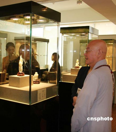 二十八日,台北梅门客栈展出玉雕《十八罗汉》,采自新疆和田的原玉在设计者和雕刻家的手中生动展现了十八罗汉惟妙惟肖的神情。图为玉雕精品济颠和尚。作者:徐长安