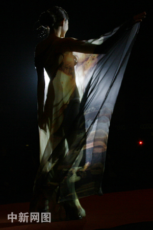 图为在镁光灯下,身着轻纱的模特曲线毕露。