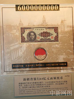 中新网上海4月19日电 上海市银行博物馆陈列的1949年5月新疆发行的面额为“60亿美元”的纸币。这是中国目前发行面额最大的纸币,在当时上海市场上仅能买到70余粒米。(作者:阮健)
