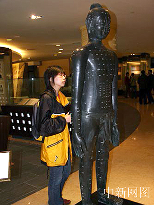 中新网上海4月19日电 4月18日网络媒体看上海活动记者来到上海中医药博物馆。图为参与活动记者被博物馆里的铜人吸引。(作者:阮健)