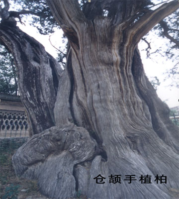 “仓颉手植柏”是庙内最古老的柏树。此柏腰围7.28米,根围9.3米,高17米,林业专家断定它足有五千年树龄。它完全可以同“黄帝手植柏”相媲美。相传当年仓颉选中这个墓穴后,便在此处栽植了这棵柏树,所以叫“仓颉手植柏”。