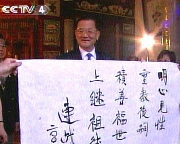 四月十九日上午,连战一行到达福建漳州马崎村祭祖并题字“明心见性,垂教后嗣,积善福世,上继祖德”。
