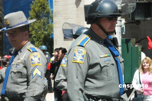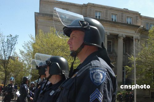中国国家主席胡锦涛四月二十一日在美国耶鲁大学发表演讲,耶鲁校园为迎接贵宾加强警力。作者:谭宏伟