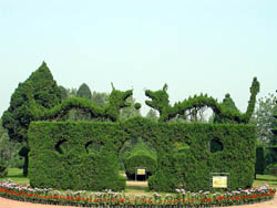 在园正中一座针叶柏亭翼然欲飞,直径4米,高5米,睛可遮,阴可避雨。以此向四周辐射,园工们精心育苗,嫁接揉编,以200多棵松柏剪成的50多种艺术形象,造形有青龙戏珠、孔雀开屏、猛虎下山。鱼游龙宫、蝴蝶迎春、百鸟朝凤。双狮把门等,神态各异,形象逼真;仿开封铁塔、天安门城楼、K长翠涵、六角柏亭、绿廊迷津,婷婷玉立,惟妙惟肖;飞机凌空。火车奔驰、轮船破浪、坦克进攻、火箭发射,似见硝烟,如临其境,引得游人如织,海山外游客观赏后无不交口称赞。