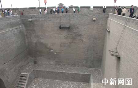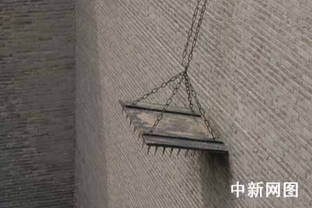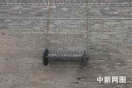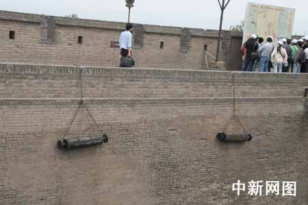 5月13日下午,首届全国网络媒体山西行采访团登上了世界文化遗产--平遥古城的城墙。图为平遥古城的瓮城中用来抵抗入侵敌人的滚木、擂石、铁钉板等物。