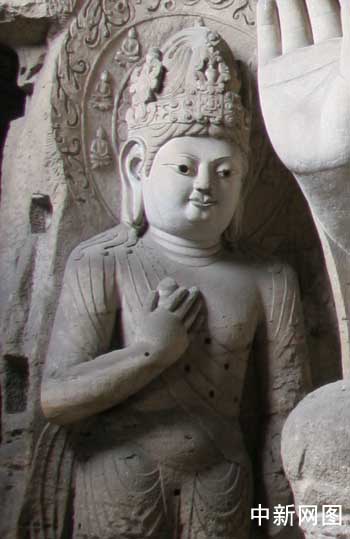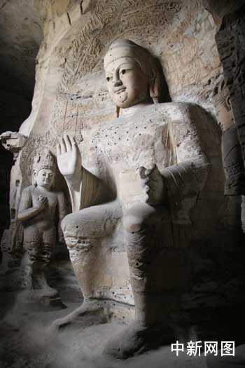 图为云冈石窟第3窟后室中的佛像。主像阿弥陀佛,倚坐式,高10米,其两侧各为观世音和大势至菩萨。这三尊造像面部圆润丰满,质感很强,菩萨头戴高宝冠,发髻梳妆向上而后下披两肩成辫,上额露出的发丝根根有序,其衣着贴体,袒露胸部,肩披络腋,其雕刻技法为平直阶梯与凸起衣纹相结合的形式。这些均与云冈北魏造像风格相异。