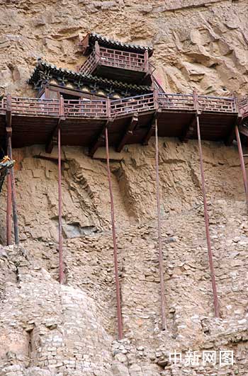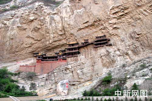 悬空寺,悬挂在北岳恒山金龙峡西侧翠屏峰的半崖峭壁间,始建于北魏太和15年(公元491年),始建初期,最高处的三教殿离地面90米,因历年河床淤积,现仅剩58米。1957年列为山西省重点文物保护单位,1982年,列入全国重点文物保护单位。整个寺院,上载危崖,下临深谷,背岩依龛,寺门向南,以西为正。全寺为木质框架式结构,依照力学原理,半插横梁为基,巧借岩石暗托,梁柱上下一体,廊栏左右紧联。仅152.5平米的面积建有大小房屋40间。悬空寺的总体布局以寺院、禅房、佛堂、三佛殿 、太乙殿、关帝庙、鼓楼、钟楼、伽蓝殿、送子观音殿、地藏王菩萨殿、千手观间殿、释迦殿、雷音殿、三官殿、纯阳宫、栈道、三教殿、五佛殿等。