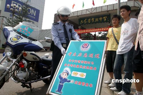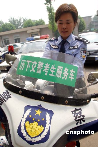 6月6日,济南交警在全市27个考点设立“考生应急通道”,配备专人、专车保证高考期间随时为有需要的考生、家长及老师提供应急服务。中新社发 龚辉 摄