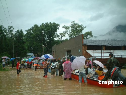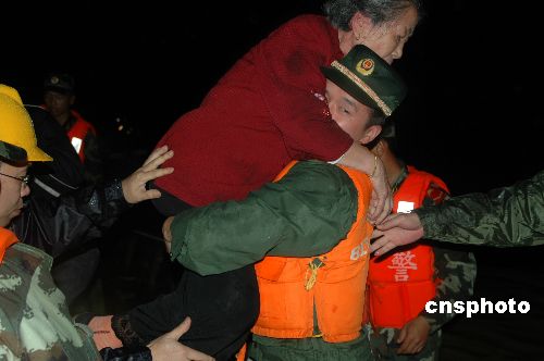 6月6日下午,福建宁德福安职业技术学校前来熟悉考场的117名高考考生和群众被洪水围困,宁德市公安边防支队福安边防大队组织22名官兵,借助冲锋舟对被困人员逐批转移。中新社发 谢贵明 摄