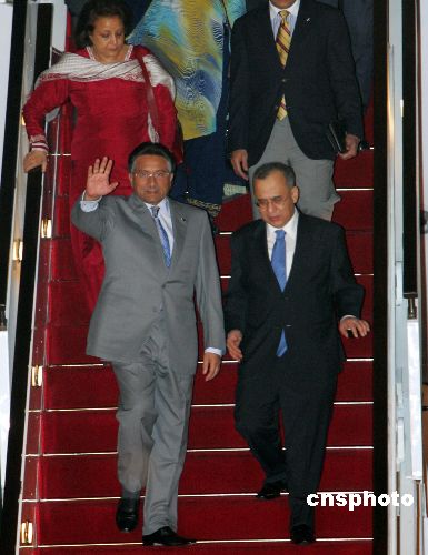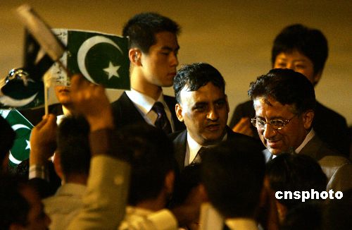 六月十三日晚,巴基斯坦总统穆沙拉夫抵达上海,他作为观察员国元首应邀出席将于十五日在上海举行的上海合作组织成员国元首理事会第六次会议。图为在机场穆沙拉夫受到热烈欢迎。中新社发 汤彦俊 摄
