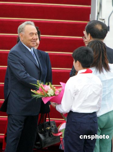 六月十三日,哈萨克斯坦总统纳扎尔巴耶夫抵达上海,他将出席十五日在上海举行的上海合作组织成员国元首理事会第六次会议。中新社发 汤彦俊 摄