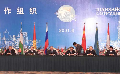 上海合作组织第一次峰会2001年6月15日在上海举行。国家主席江泽民和哈总统纳扎尔巴耶夫、吉总统阿卡耶夫、俄总统普京、塔总统拉赫莫诺夫、乌总统卡里莫夫出席。