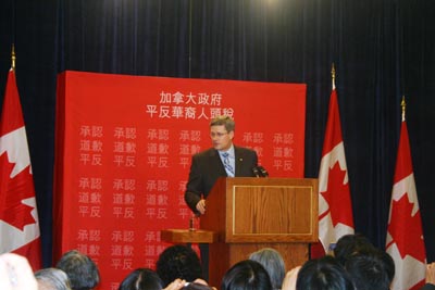 今天是加拿大华裔,也应该说是整个北美华裔社群值得永远记住的历史性大日子。由加拿大总理亲自主持,国会通过的华裔人头税平反道歉仪式在渥京隆重举行。加拿大华裔心中伤痛了整整一个世纪,也努力坚持了20多年要求平反昭雪的人头税冤案,终于正式划上了句号。虽然是迟来的正义,当年遭遇人头税苦难的八万多人也只有很小很小一部分人在世,但是,整个加拿大华裔社群还是为今天的道歉仪式流泪激动,欢呼历史的公义终究得以实现,也赞赏今天的保守党政府和在野党勇于面对加拿大历史上的错误,决定以正确和前瞻性的态度处理这个历史悬案,以为后人的警示,不要让歧视人权和弱势族群的悲剧重演。