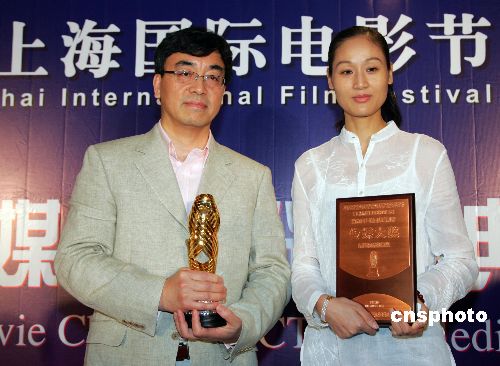 六月二十四日,著名艺术家陈逸飞的遗作、国产影片《理发师》获上海国际电影节传媒大奖“最佳视听效果奖”。图为陈逸飞先生的遗孀宋美英女士和陈逸飞的弟弟陈逸明先生专程前来为《理发师》一片领奖。中新社发 潘索菲 摄