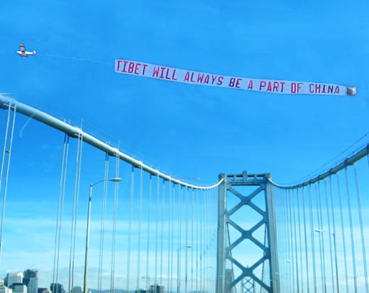 华人华侨还为这次传递活动租用了两架直升飞机,盘旋在沿途的上空。一架飞机上用英文拉出横幅,“TIBET WILL AIWAYS BE A PART OF CHINA(西藏永远是中国的一部分)”,另外一个横幅是:“GO BEIJING CHINA!GO OLYMPICS!(欢迎到北京看奥运会)”。