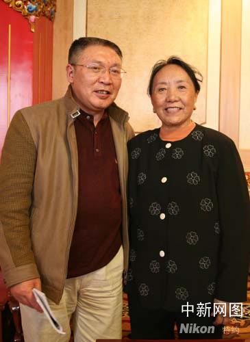 第一代著名藏族歌唱家才旦卓玛日前接受中新社记者采访时表示希望藏族青年一代珍惜来之不易的美好生活及大好形势。图为才旦卓玛与记者合影。 贾长飞 摄影