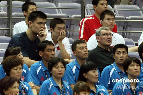 7月31日,国际篮联2008钻石杯男篮比赛继续在江苏南京进行,与中国男篮同分在一个小组的安哥拉男篮和澳大利亚队展开对决。中国队主教练尤纳斯率姚明等球员在观众席上观看比赛。中新社发 盛佳鹏 摄