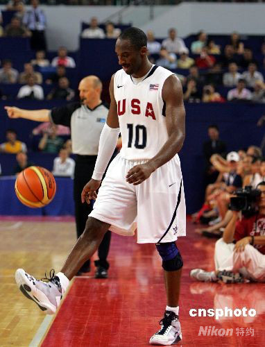 8月3日,美国男篮国际挑战赛上海站比赛在旗忠网球中心举行。球星云集的美国男篮最终凭借出色发挥以89比68战胜俄罗斯队。美国球星科比·布莱恩特 (Kobe Bryant)比赛间隙在观众面前大秀“脚功”。中新社发 汤彦俊 摄