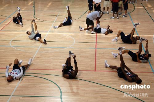 8月7日中午,美国男篮“梦八队”在北京开始抵京后的首次训练。 中新社发 赖松 摄