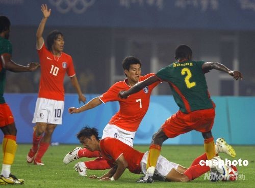8月7日,北京奥运男子足球预赛,韩国对喀麦隆比赛在秦皇岛奥体中心举行,双方1:1战平。图为韩国队7号吴桩恩(红衣)与喀麦隆队2号阿尔贝·巴宁在比赛中激烈争抢。中新社发 刘新 摄