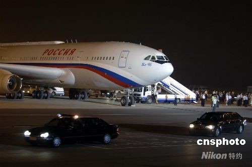 8月7日晚,俄罗斯总理普京抵达北京首都机场,将参加奥运会开幕式。图为其专车(右)从其专机前驶过。中新社发 王东明 摄