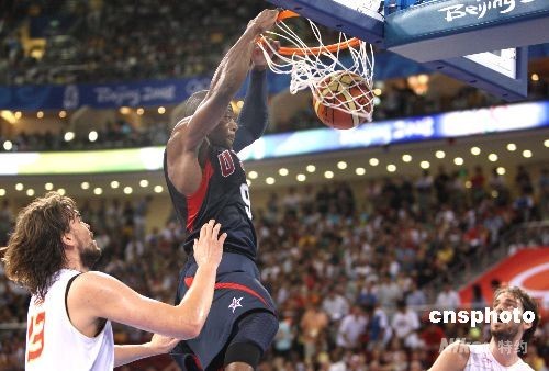 北京奥运会男子篮球小组赛第四轮比赛8月16日在五棵松篮球馆举行,同为三战三胜的美国“梦八队”、世锦赛冠军西班牙队,午夜时分展开惊心动魄的激情碰撞。最后美国队以119比82击败西班牙队。图为韦德突破加索尔兄弟的防守扣篮。中新社发 任晨鸣 摄