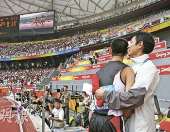 起步较迟的苏桦伟原本一度落后其它选手数个身位,但凭着凌厉后劲,最终以12秒38冲线。跨过终点的他眼泛泪光,打算离场之际,发现无论在生活及比赛中都一直支持他的艺人刘德华,早已在终点守候,两人随即握手相拥。逾万观众看到这一幕,欢呼喝彩声响彻云霄。