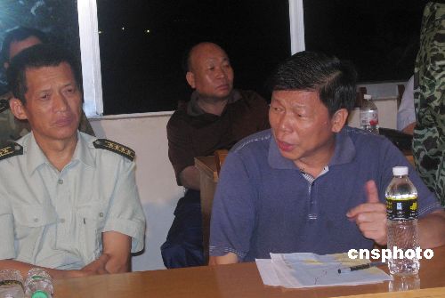 受今年第六号台风“派比安”影响,广西北海地区八月三日晚狂风大作、暴雨倾盆,该市有四十余艘渔船和上百名渔民因故停滞港外。中共广西区委常委、北海市委书记温卡华(右一)心急如焚,彻夜坐镇该市海上消防中队,组织相关单位负责人及驻军首长开展营救工作。中新社发 杨强 摄