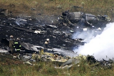 俄罗斯一架飞往圣彼得堡的图154客机8月22日在乌克兰东部坠毁,机上约有160名乘客和11名机组人员。图为俄消防队员在客机失事现场工作。(固山)