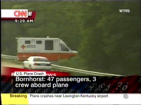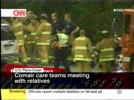 一架CRJ-100中型客机27日凌晨(北京时间18:07)在美国肯塔基州列克星敦市机场坠毁,机上至少49人遇难。图为救援人员赶赴现场。(春风)