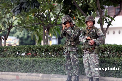 泰国军事政变后,全国进入紧急状态,连日来,驻守在曼谷的士兵仍然严阵以待,但局势渐趋平稳,曼谷街头的气氛也相对缓和。中新社发 洪少葵 摄