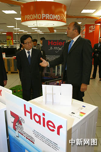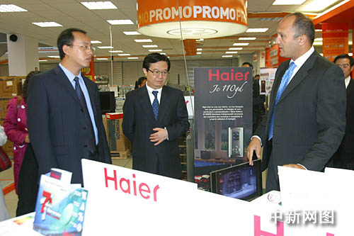 “中国品牌海外行”采访团在意大利米兰参观海尔卖场。海尔欧洲管理层向商务部副部长高虎城介绍海尔产品。