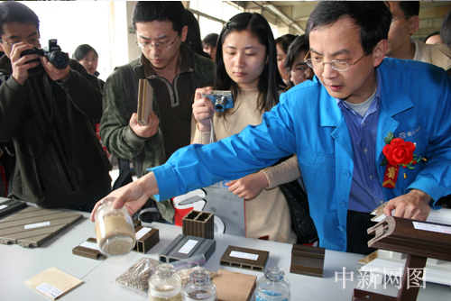 作为生态示范区,杨凌特别注重环境保护。今天,采访团在杨凌参观了环保节能的项目“木塑”。“木塑”被称为“液体木材”,它能将木屑、秸秆、稻壳、竹片、麻纤维等废弃纤维和塑料废弃物两种材料有机组合在一起,制成天然纤维再生塑料基复合材料。这种材料不仅具有天然木材的外观特性,而且保留了塑料的化学稳定性能,可以广泛代替木材、塑料等,并能有效解决环境污染问题。
