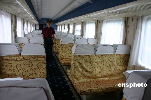 青藏铁路高原列车的藏民族特色非常明显,主要体现在车厢内饰上。图为T22次列车定员98人的硬座车厢。中新社发 杨杰 摄