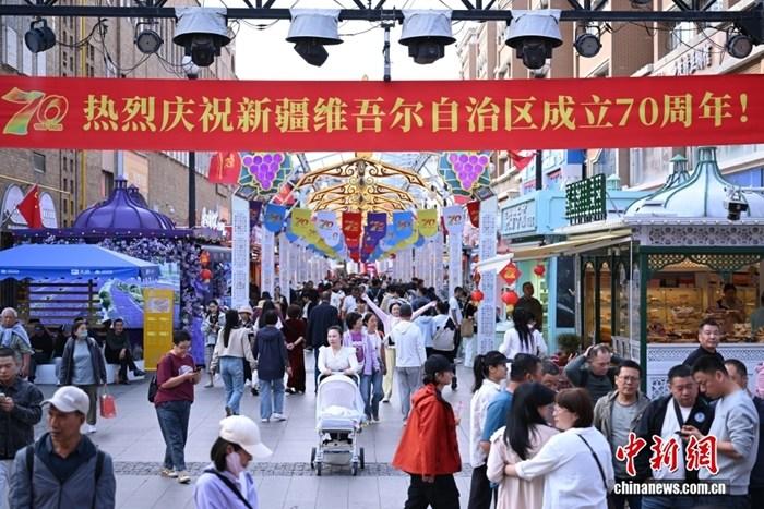 (砥砺奋进七十载 天山南北谱华章)乌鲁木齐和田二街夜市吸引游客