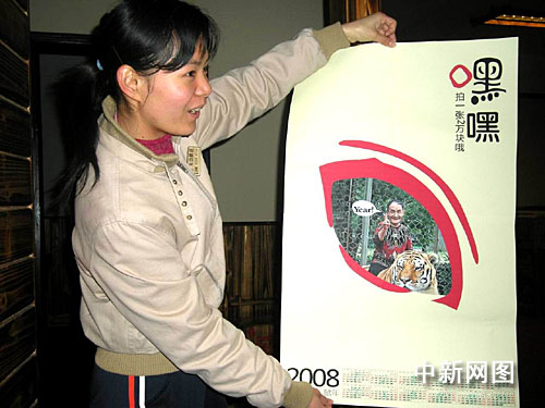 记者看到,网友“小二黑”的“周老虎年画”作品非常简洁、有趣,颇具幽默和满讽刺。年画左上角写着“黑嘿,拍一张2万元”,中间是身材瘦小、眉开眼笑的周正龙骑在一只老虎背上,挥手致意,下面是2008年的日历。