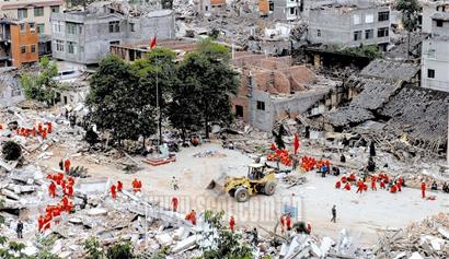 南坝的街道破坏非常严重,不少房屋的一层已消失,原来的二楼变成了一楼。记者了解到,在地震次日清早,就有一支特种兵空降部队赶到这里。空降某师一位中校透露说,目前,一个整建制团在南坝紧张救援,他们已救助和抢运伤员374人,从废墟中救出5人。